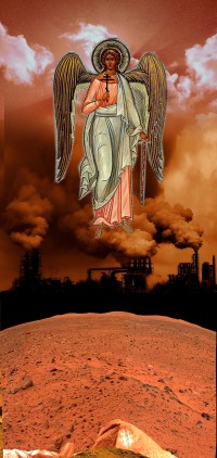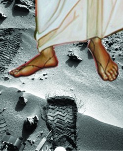 This egg tempera painting on gesso board is a synthesis of two primary images. The Christ figure is from a byzantine sacred icon of ‘The Transfiguration of Christ on Mount Tabor’ and the landscape is appropriated from a NASA photo taken from their robot ‘Spirit’ as it travels across the terrain of the planet Mars.