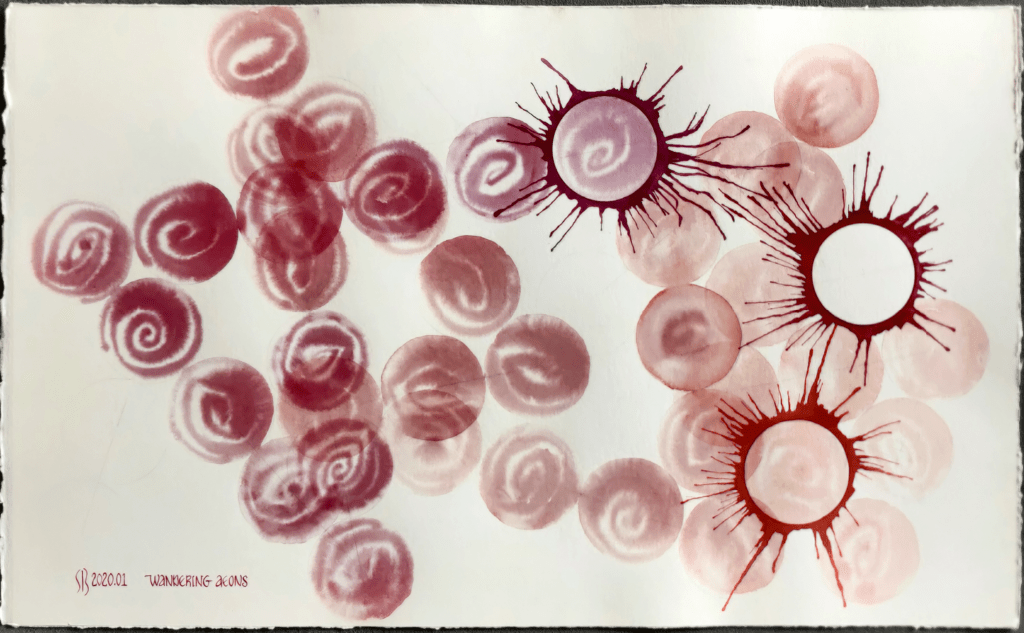 The works on paper in this exhibition were created during a creative retreat and media blackout during January 2020 at a ‘Silence, Awareness, Existence’ artist residency at Arteles Creative Centre in Finland. The primary method of applying the pigments to paper is through breath (blowing) and through water (bleeding). The egg tempera on board icon paintings evolved from these works.