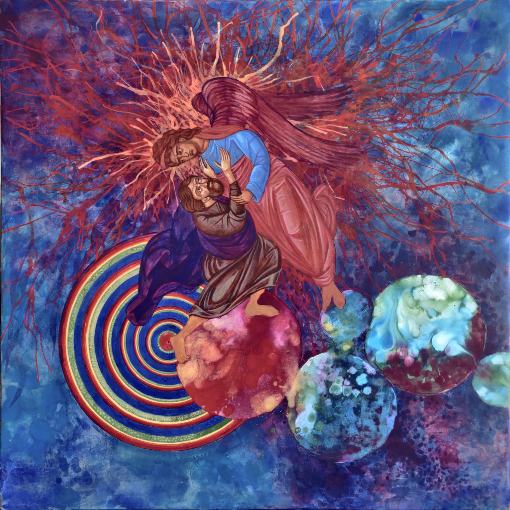 ARTIST STATEMENT: Angels track on cellular and galactic filaments. I cannot sense them, only know them in the love they leave behind. Quietly they come to this end from the beginning, wheeling on cosmic paths of lonely particles, spread so very thin. They are in love with God, but wait for me, the Seraphim and Ophanim. My eyes are shut, sleep is inevitable, is it? They circle the multiverse, waiting for a moment; a rip in the infinite, a small sliver, a golden tear, a cellular membrane, a thought stretched out, a dart of longing, a sigh, a breath. Their viral intelligence spreads across the aeons. In every breath we ask them to enter our short mortality. They are trapped in infinity. Trying to get in. And be so diluted? We are trapped in a moment, trying to get out. Remember the Christ of a thousand suns? In sacred symmetry of CO2 there is a way. The beryl merkaba of Ezekiel. A living creature, microbes & bio-membranes. Christ searching for His beloved also took a shortcut. He left tracks. I follow them. It is elemental, it is sacred matter. Why do we destroy it? Force it to comply to our will? Christ would say stop, if He were listened too. But we persist in torturing His ghost of nitrogen and her seven sisters. Breaking bonds that cannot easily be redeemed. Our life-giver and life-taker, a planetary boundary exceeded. Now we must work hard, to feel past the sensual limitations of this small green and blue decad. This beautiful wild five, but polarised. A forgotten fifth element, and controlled wisdom ratios. Our hip will be burst, and we will limp across the multiverse. Forced to go so slowly into the future that the path disappears in front of us, some filaments are already so faint. Quickly, turn our mind to our heart to know; learn to feel. That is, repent. Learn to feel the path of the filament to God. It is a blue wash in a golden flower, resting quietly on the stop of infinite bifurcations.